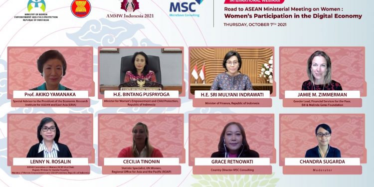 Jakarta – Menteri Pemberdayaan Perempuan dan Perlindungan Anak, Bintang Puspayoga menekankan pentingnya menguatkan pemberdayaan perempuan melalui ekonomi digital dan inklusi keuangan untuk memulihkan ekonomi bangsa maupun global khususnya di kawasan ASEAN pasca pandemi Covid-19. ”Indonesia adalah negara anggota ASEAN dengan jumlah populasi terbanyak, dimana perempuan mengisi hampir setengahnya. Dari jumlah perempuan tersebut, 54 persen di antaranya berada pada usia produktif. Oleh karenanya, perempuan berpotensi besar terhadap pertumbuhan ekonomi jika diberikan kesempatan luas dan dukungan yang baik,” ungkap Menteri Bintang dalam Webinar Internasional Road to ASEAN Ministerial Meeting on Women: ‘Women’s Participation in the Digital Economy’ yang dilaksanakan Kemen PPPA bekerjasama dengan MicroSave Consulting (MSC).