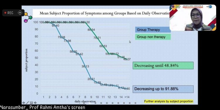 “Setelah 8 hari terlihat perbandingan hasil signifikan di kelompok A dan B dimana pada Kelompok A, gejala pada pasien mulai menurun pada hari ke-2 hingga ke-14 dengan tingkat penurunan sebesar 91,88 persen,” terangnya.