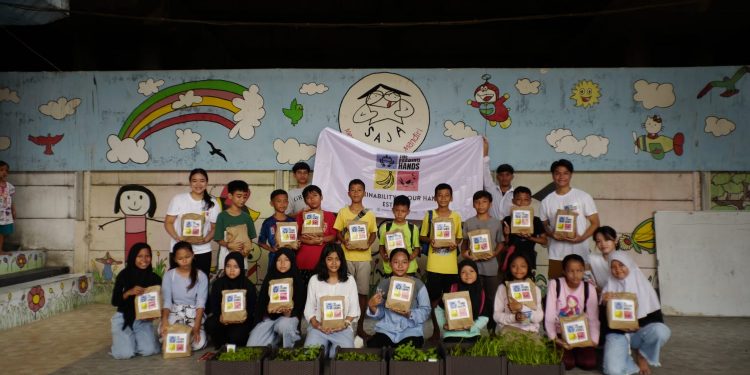 Selain membagikan makanan, mereka juga mengajarkan anak-anak kelas empat di sanggar SAJA cara menanam sayuran. “Tanaman ini dibuat dari kompos sisa makanan. Dari rumah-rumah kita gabungin lalu kita bikin pupuk kompos sendiri,” jelas Danica.