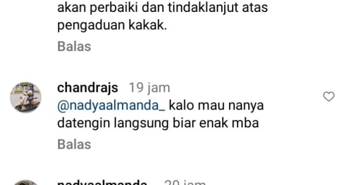 “Halo kak nadya, masalahnya sudah cleat ya kak, mohon maaf atas ketidaknyamannya. Kami akan perbaiki dan tindaklanjut atas pengaduan kaka,” tulisnya.